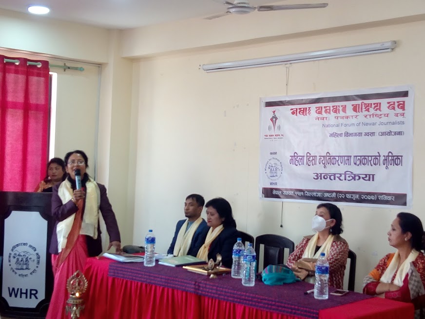 महिला हिंसा न्यूनिकरणमा पत्रकारकाे भूमिका विषयक अन्तर्क्रिया पनि गरिएकाे कार्यक्रममा मानव अधिकारका लागि महिला, एक महिला समूहकी संस्थापक एवम् राष्ट्रिय महिला आयोगका सदस्य लिलि थापा र सिविन नेपालया कार्यकारी निर्देशक सुम्निमा तुलाधरले प्रमुख वक्ताका रूपमा महिला र बालिकाहरूले भाेगिरहेका हिंसाका घटना सम्बन्धमा जानकारी राखेका थिए ।
