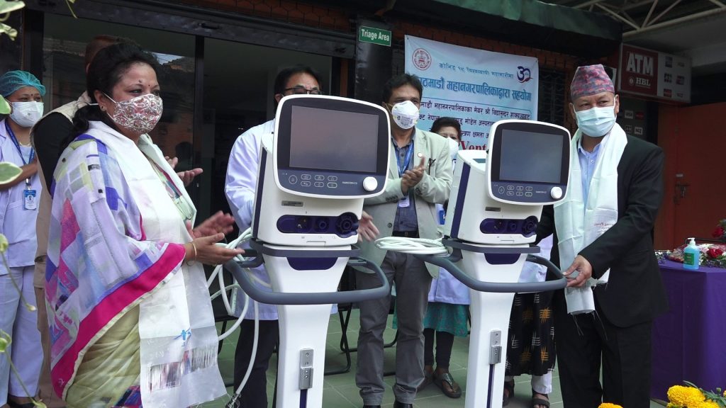 काठमाडाैं महानगरपालिकाले कोभिड संक्रमित विरामीहरुको उपचारमा सहजता ल्याउनका लागि काठमाडाैं मोडल अस्पताल र हेल्पिङ्ग ह्याण्डस् सामुदायिक अस्पताललाई दुई दुई थान भेण्टिलेटर मेसिन हस्तान्तरण गरेको छ ।