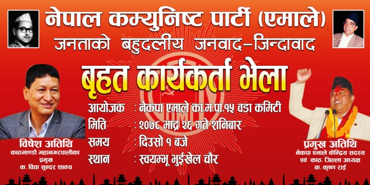 नेपाल कम्युनिष्ट पार्टी एमाले काठमाडौँ महानगर १५ शाखा कमिटीले आउँदो शनिवार बृहत कार्यकर्ता भेला तथा प्रशिक्षण कार्यक्रम गर्ने भएको छ ।