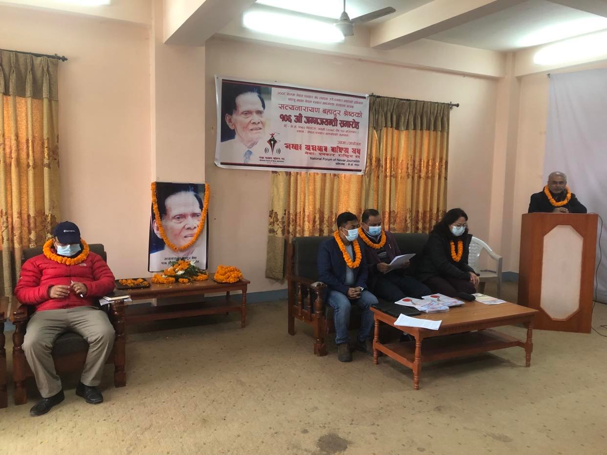 नेवाः पत्रकार राष्ट्रिय दबूले नेपाल पत्रकार महासंघको संस्थापक अध्यक्ष स्वर्गीय सत्यनारायण बहादुर श्रेष्ठलाई नेपाल घोषणा गर्न माग गर्दै उहाँको १०६ औं जन्मजयन्ती नेपाल पत्रकार महासंघको सभाकक्षमा पौष १३ गते मंगलवार एक कार्यक्रमको आयोजना गरेको थियो ।