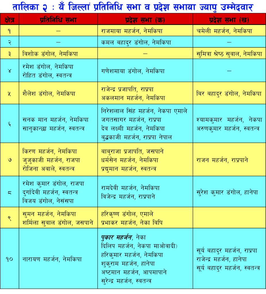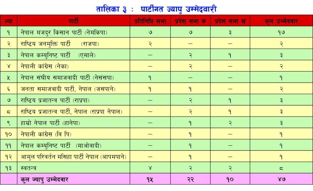 थन लुमंके बहजु, थथे प्रतिनिधि सभाया लागि १५, प्रदेश सभा क क्षेत्रय् २२ व प्रदेश सभा ख क्षेत्र १० जना याना ४७ जना ज्यापु उम्मेदवार न्ह्यःने खने दत । वय्कःपिसं पार्टीगत व स्वतन्त्रकथं उम्मेदवारी बिया दिउगु खः । (तालिका ३)
