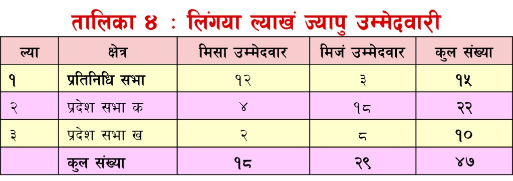 थुगुसिया चुनावय् १२ गु राजनैतिक पार्टीपाखे ज्यापुत उम्मेदवार जुगु दु । लैंगिक हिसावं स्वय्बलय् ४७ उम्मेदवार मध्ये मिसा १८ व मिजं २९ दु । (तालिका ४)