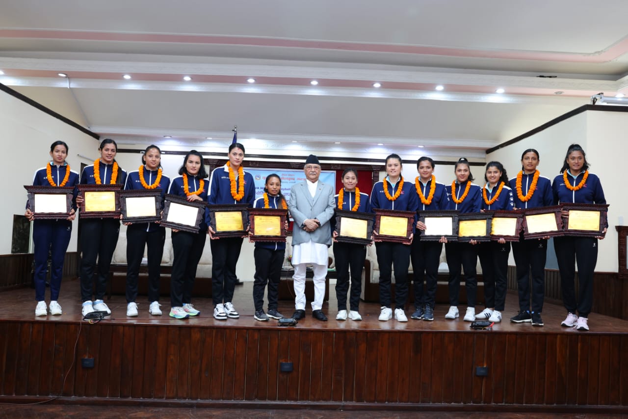 कार्यक्रममा सो टोलीका क्याप्टेन अरुणा शाहीसहित १४ खेलाडीलाई जनही रु तीन लाख, मुख्य प्रशिक्षक जगदीशप्रसाद भट्टलाई रु दुई लाख, सहायक प्रशिक्षक भरत यादव, व्यवस्थापक निलमसिंह बज्राचार्यलाई र फिजियो लोकेन्द्र कुँवरलाई जनही रु एक लाख २० हजार राशीसहित पुरस्कार प्रदान गरिएको हो । गत साउन १७ देखि २३ गतेसम्म काठमाडौँमा भएको उक्त खेलमा नेपालले उत्कृष्ट प्रदर्शनसहित दोस्रो स्थान हासिल गरेको थियो ।