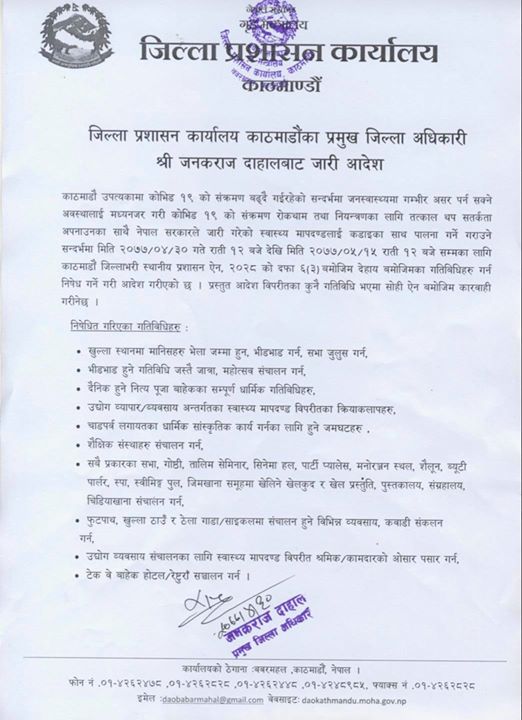 विश्वभर फैलिरहेकाे काेराेना माहामारी नियन्त्रणका लागि भन्दै काठमाडाैंका प्रमुख जिल्ला अधिकारी जनकराज दाहालले १० बुँदे अादेश जारी गरेकाे छ ।