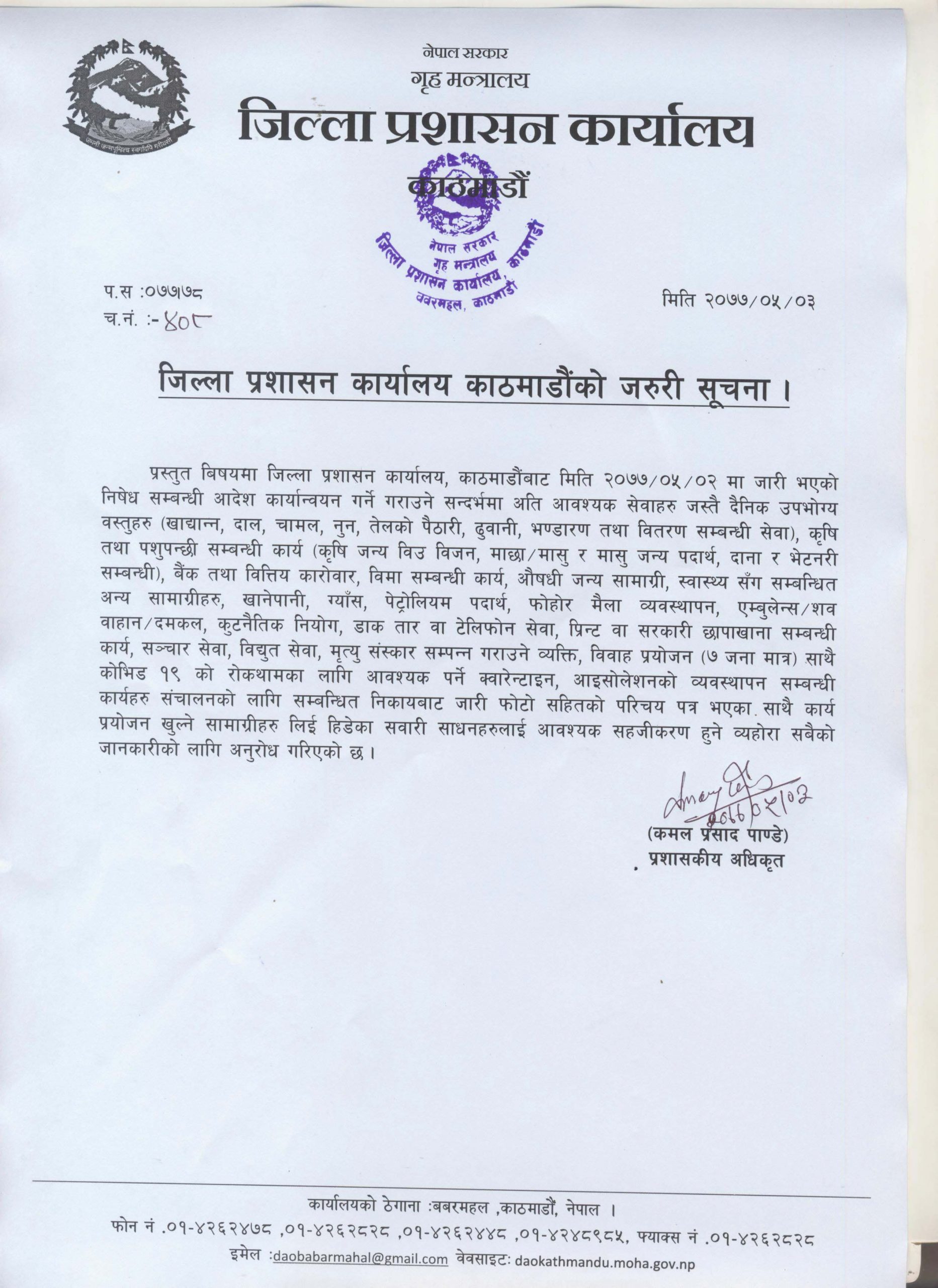 यसै क्रममा जिल्ला प्रशासन कार्यालयले एक सूचना जारी गर्दै निम्न सेवाहरू सञ्चालनका लागि सहजीकरणा हुने जनाएकाे छ ः