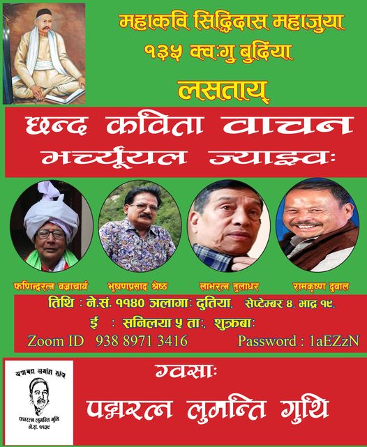 पद्मरत्न लुमन्ति गुथिकाे आयाेजनामा नेपालभाषाका महाकवि सिद्धिदास अमात्य (महाजु)काे १५३ औं जन्म जयन्तीका अवसरमा छन्द कविता गाेष्ठी हुने भएकाे छ ।